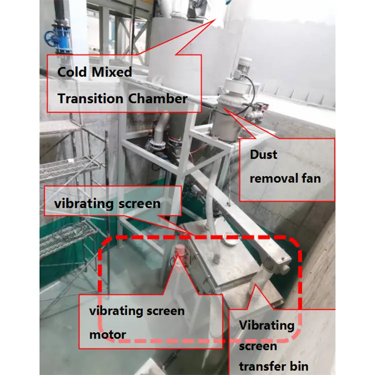 Den vibrerande silen som levereras av FANCHANG Machinery används för att sila de blandade färdiga materialen. Den är utrustad med en rostfri skärm inuti och har vibrationsmotorer på båda sidor. Genom vibrationsskärmning avlägsnas stora partiklar och andra föroreningar och det kvalificerade pulvret töms ut i förvaringskärlet eller transportanordningen.